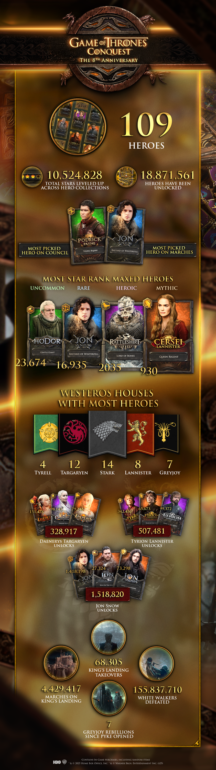 Depuis le 8ème anniversaire du jeu, les joueurs ont collectivement débloqué des héros près de 19 millions de fois, allant des personnages préférés des fans comme « Rhaenyra Targaryen - La Reine Noire » à des alliés improbables tels que « Le Roi de la Nuit - Premier Marcheur Blanc ». Les joueurs ont également tenté de s’emparer du Trône de Fer et ont marché sur Port-Réal plus de 4,4 millions de fois.