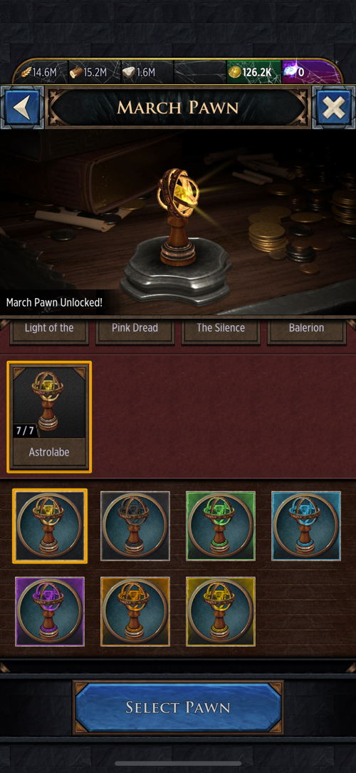 En guise de cadeau spécial pour le 8ème anniversaire, tous les joueurs qui se connecteront au jeu pendant la période de célébration entre le 7 et le 26 octobre recevront un pion d’Astrolabe exclusif. Inspiré du thème d'ouverture de la série originale « Game of Thrones », ce sera le premier pion de marche entièrement animé publié dans Game of Thrones: Conquest. Les joueurs pourront également débloquer une variante argentée de l'Astrolabe en accomplissant des quêtes quotidiennes pendant sept jours à compter du 20 octobre.